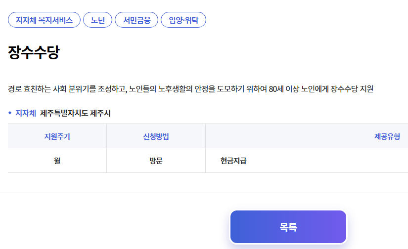 제주도는 만 80세 이상이면 매달 2만 5천 원을 수령할 수 있습니다.