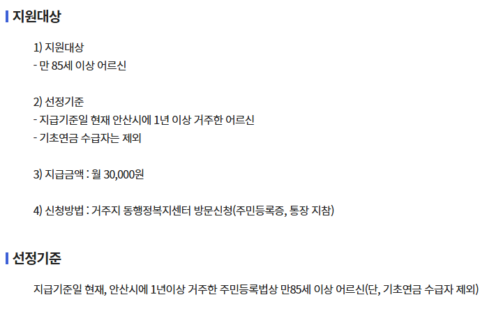 안산시는 만 85세 이상 어르신에게 매월 3만 원을 지급합니다.