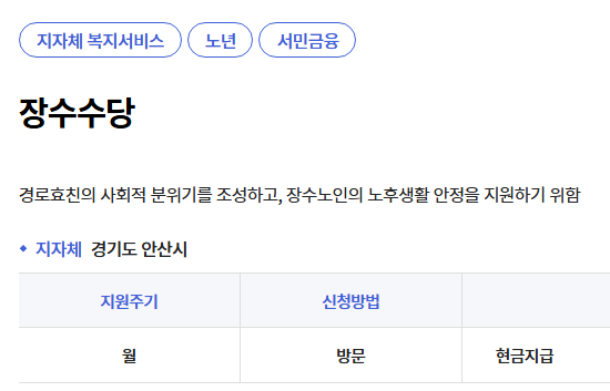 지급 방식은 월별, 연별, 1회 지급 등 다양해 희소성과 투자 가치가 높습니다. 본인 거주 지역 기준으로 장수수당을 신청하면 혜택을 확인할 수 있습니다.