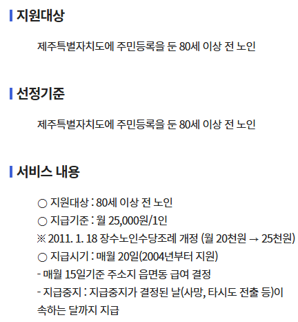 제주도는 만 80세 이상이면 매월 2만 5천 원을 지급합니다.