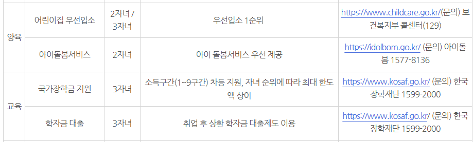 어린이집 우선 입소와 학자금 융자 금리 우대도 포함됩니다.
