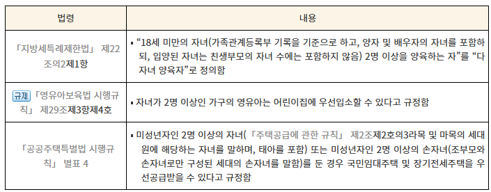 네, 기존 3자녀 이상에서 2자녀 이상으로 기준이 완화되어 대부분의 제도를 적용받습니다.