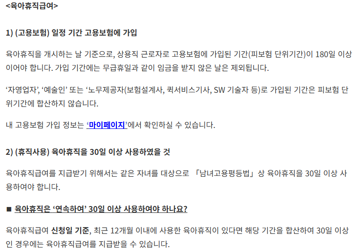 육아휴직 개시일 기준 고용보장 가입 기간이 180일 이상이어야 신청할 수 있습니다.