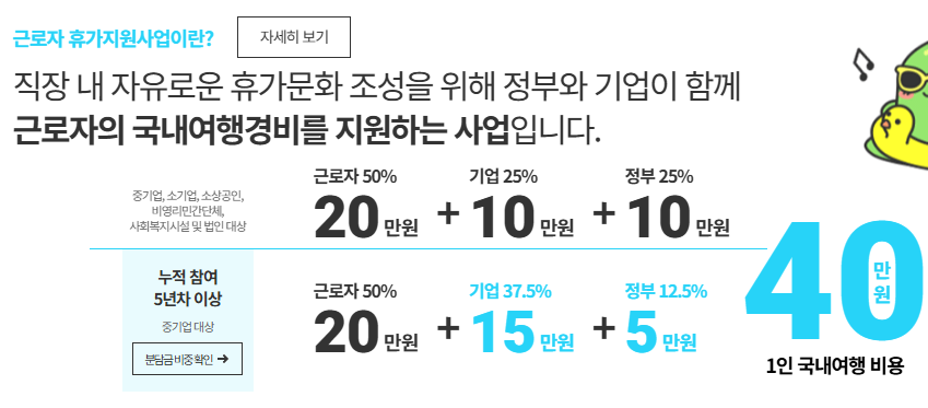 특히 올해는 기업 분담금 비율이 조정되고 수도권 숙박까지 지원 범위가 확대되는 등 제도적 변화가 있었습니다. 근로자 휴가비 지원사업 내용은 한국관광공사 지원 공식 홈페이지에서 확인할 수 있습니다.