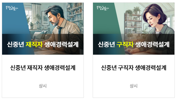 중장년 평생현역 프로젝트. 중장년내일센터의 생애경력설계, 전직지원 프로그램을 언제 어디서나 온라인 학습을 통해 체계적으로 준비할 수 있습니다