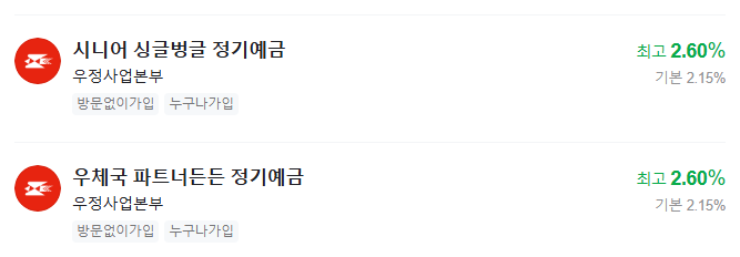 파트너든든 정기예금의 경우 최고 연 2.60%로 우체국 상품 중 가장 높은 금리에 속합니다.