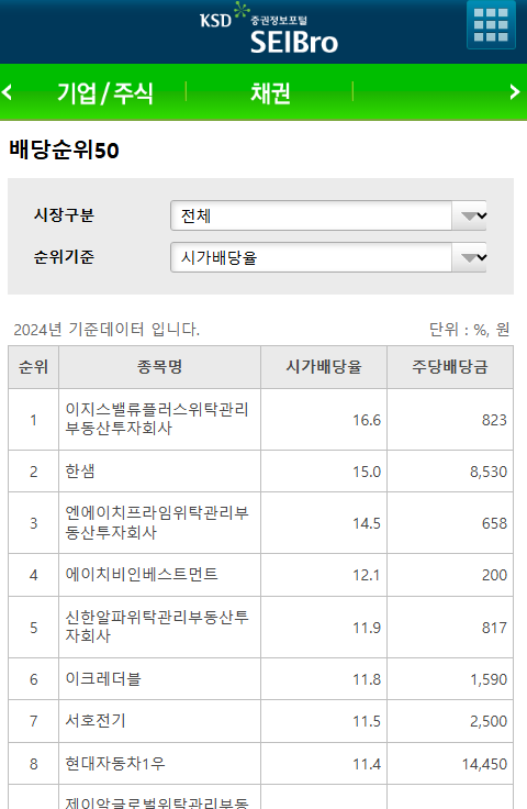 배당순위50 2024년 기준데이터 입니다.단위 : %, 원 순위종목명시가배당율주당배당금 1 이지스밸류플러스위탁관리부동산투자회사 16.6 823 2 한샘 15.0 8,530 3 엔에이치프라임위탁관리부동산투자회사