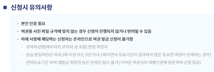 미성년자나 법정대리인이 필요한 경우, 혹은 여권 정보 변경이 필요한 경우에는 온라인 신청이 불가합니다. 이때는 관할 여권과를 직접 방문해야 합니다.