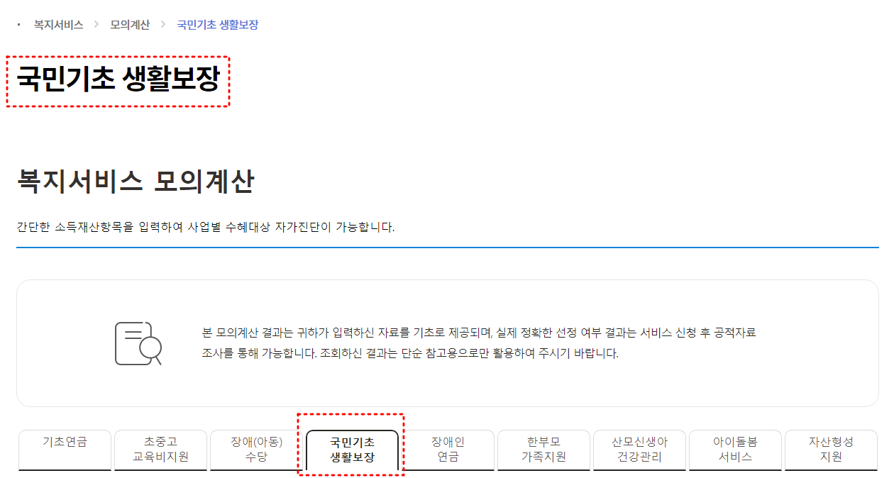 차상위계층 기준을 잡기 어려울 때에는 복지로 홈페이지에서, 복지서비스 모의계산의 국민기초생활보장 모의계산을 이용하시면 좋습니다.