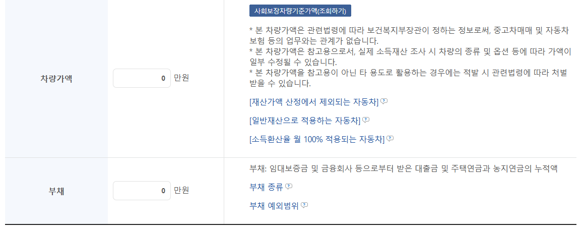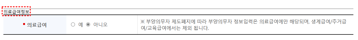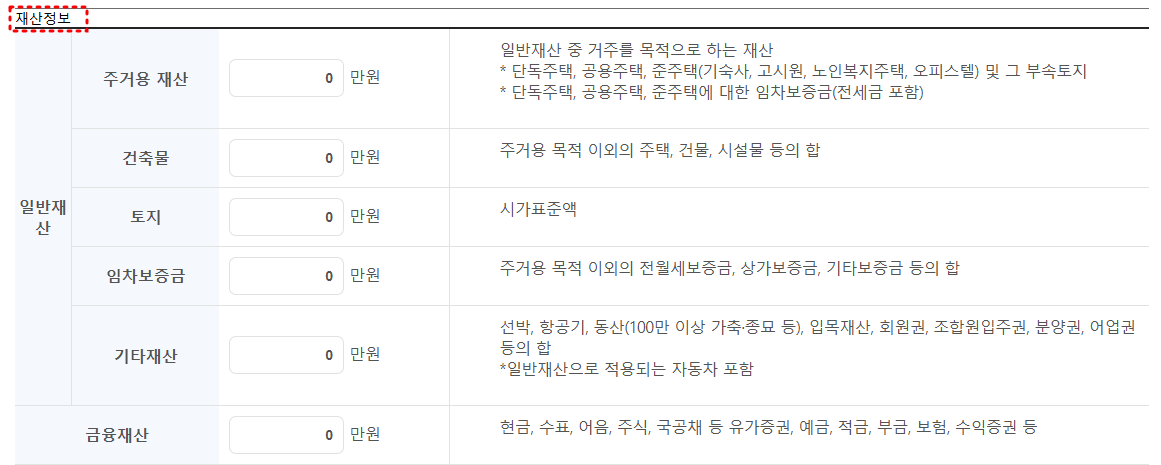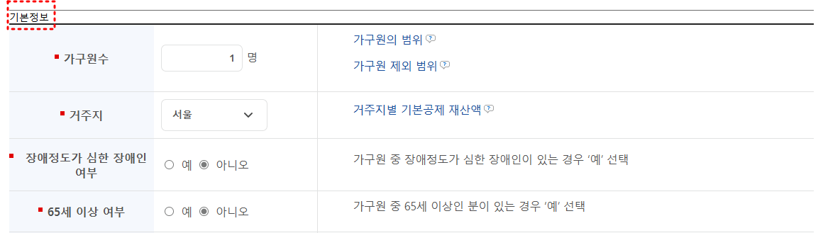 기본정보, 소득정보, 재산정보, 의료급여정보의 4가지 파트에 대해서 본인의 환경에 맞게 입력하시면 됩니다.