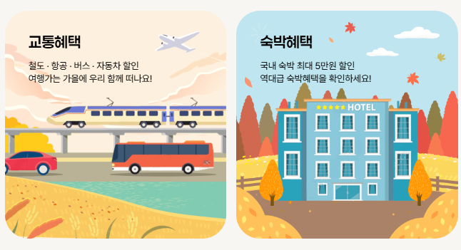 또한 KTX·SRT·고속버스 등 교통수단은 30~50% 할인 혜택을 받을 수 있어 여행비 부담이 줄어듭니다.