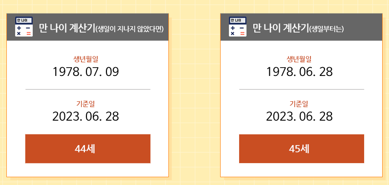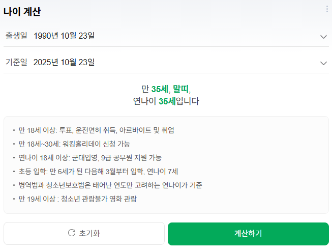 정확한 계산은 온라인 ‘나이 계산기’나 가족관계등록부 생년월일을 기준으로 확인하실 수 있습니다.