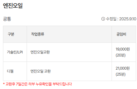오일 규격, 차량 용량, 브랜드, 정비소 공임 등 복합 요인이 반영되기 때문입니다.