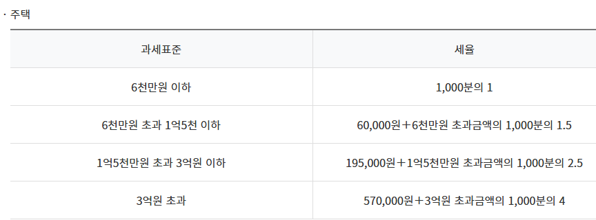 과세표준금액이 6천만 원 이하인 경우 세율은 0.1%로, 다주택자보다 낮은 수준입니다.