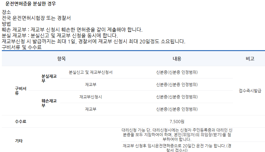 운전면허시험장 방문 시 7,500원의 수수료가 부과되며, 즉시 재발급이 가능합니다.