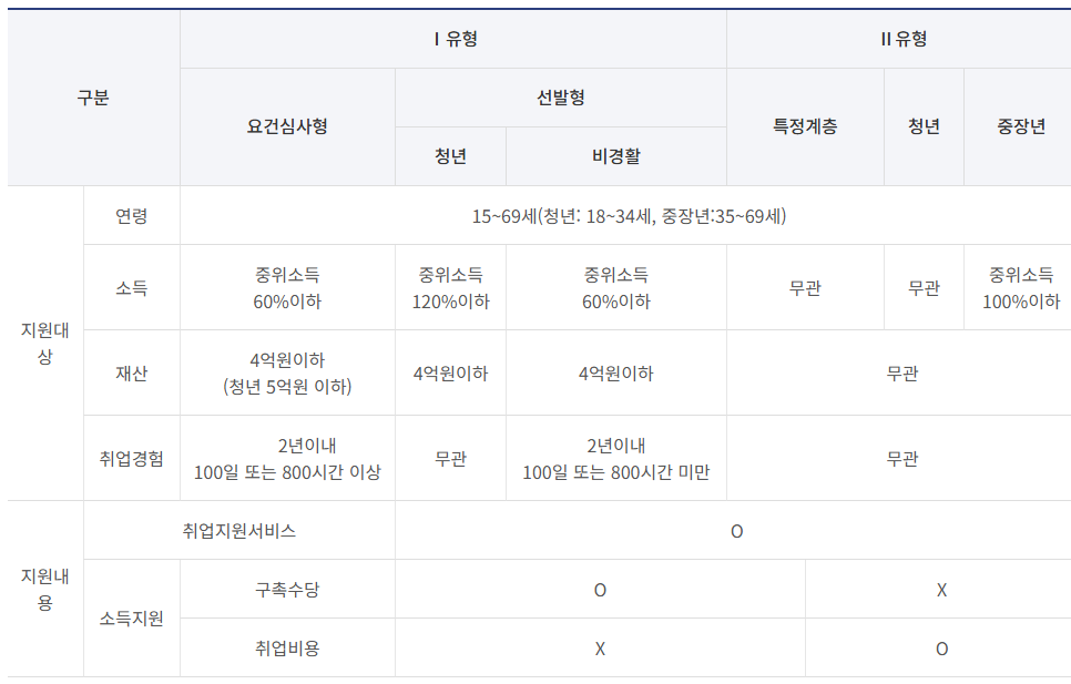 Ⅰ유형은 저소득 구직자를 대상으로 하는 지원형으로, 가구단위 중위소득 60% 이하가 주요 기준입니다.