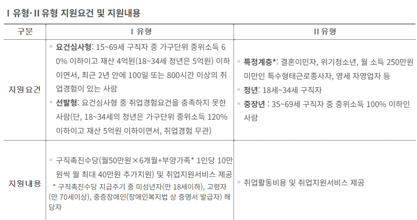 Ⅰ유형은 저소득 구직자를 대상으로 하는 지원형으로, 가구단위 중위소득 60% 이하가 주요 기준입니다.