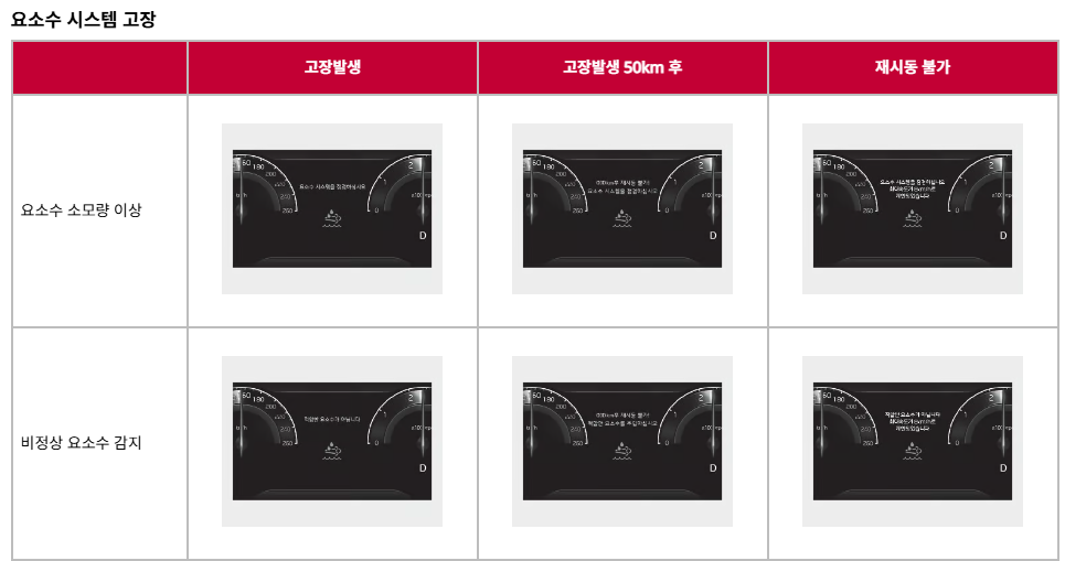 이때 “요소수를 보충하십시오. 재시동이 불가능합니다”라는 문구가 계기판에 표시됩니다.