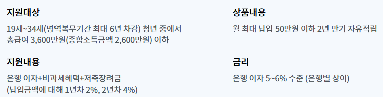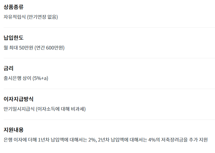 2년 만기 상품으로 매월 최대 50만 원까지 납입할 수 있으며, 정부가 저축장려금 형태로 추가 이자를 지급합니다.