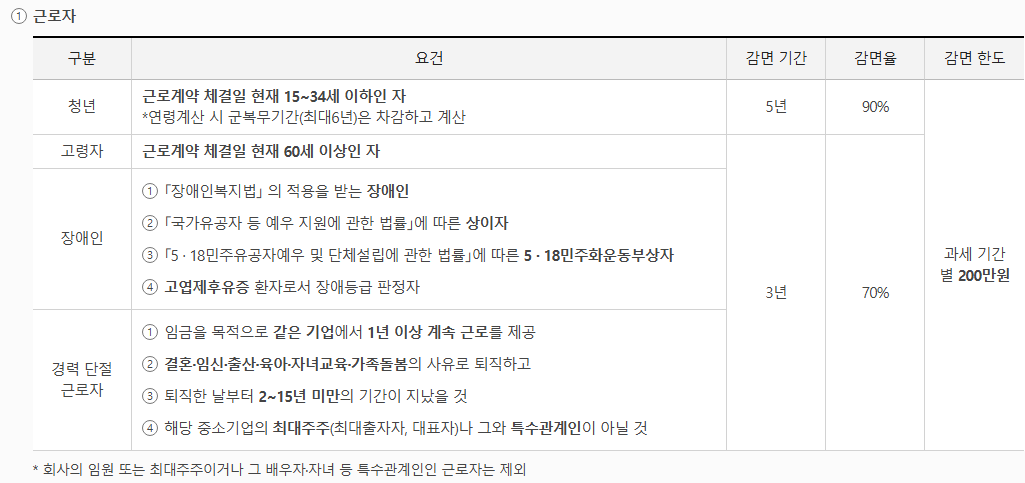청년은 90%, 장애인·60세 이상 근로자는 70%, 경력단절여성은 50%로 감면율이 다르게 적용됩니다.