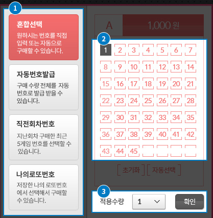 로또 6/45 인터넷 구매방법 안내 로또번호 선택 방법 6개의 번호를 모두 또는 부분적으로 선택할 수 있는 혼합, 시스템 자동발급, 직전회차 번호 재선택, 저장한 로또번호 중에서 선택할 수 있습