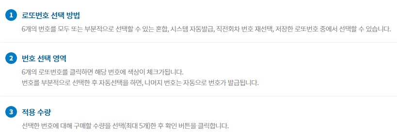 로또 6/45 인터넷 구매방법 안내 로또번호 선택 방법 6개의 번호를 모두 또는 부분적으로 선택할 수 있는 혼합, 시스템 자동발급, 직전회차 번호 재선택, 저장한 로또번호 중에서 선택할 수 있습