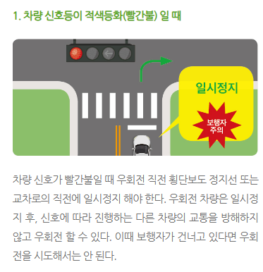 우회전시 횡단보도 파란불이 켜지면 보행자 접근 여부와 무관하게 반드시 일시정지해야 합니다.
