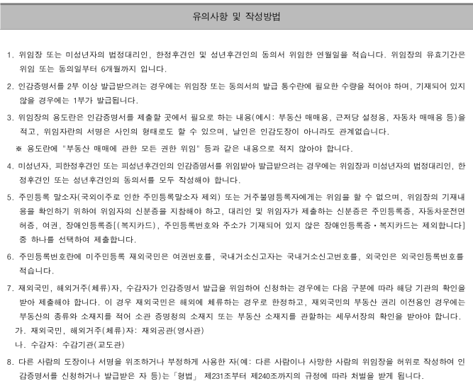 위임장 정보가 불명확하거나 서명 필체가 불일치할 경우 발급은 제한됩니다.