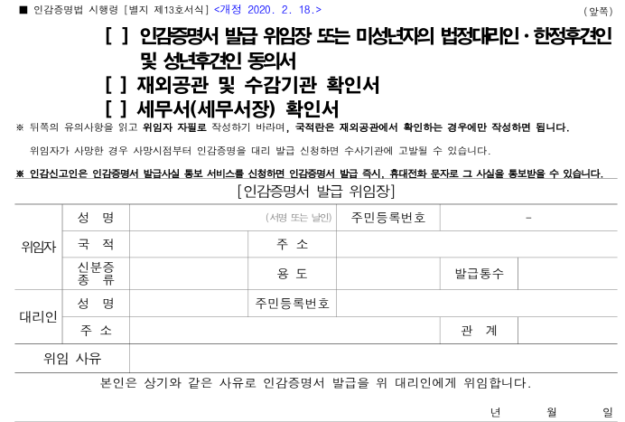 대리발급에는 인감도장이 필요하지 않으며 위임장 작성 시 자필 서명만으로도 인정됩니다.