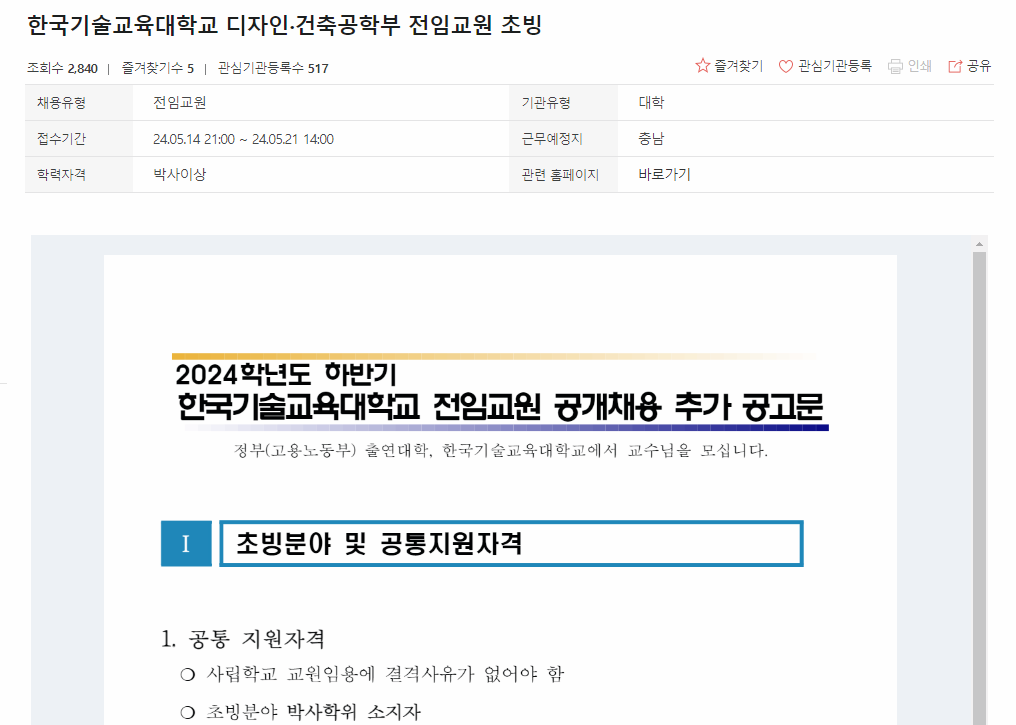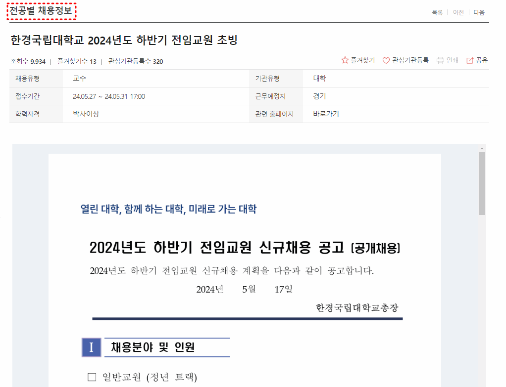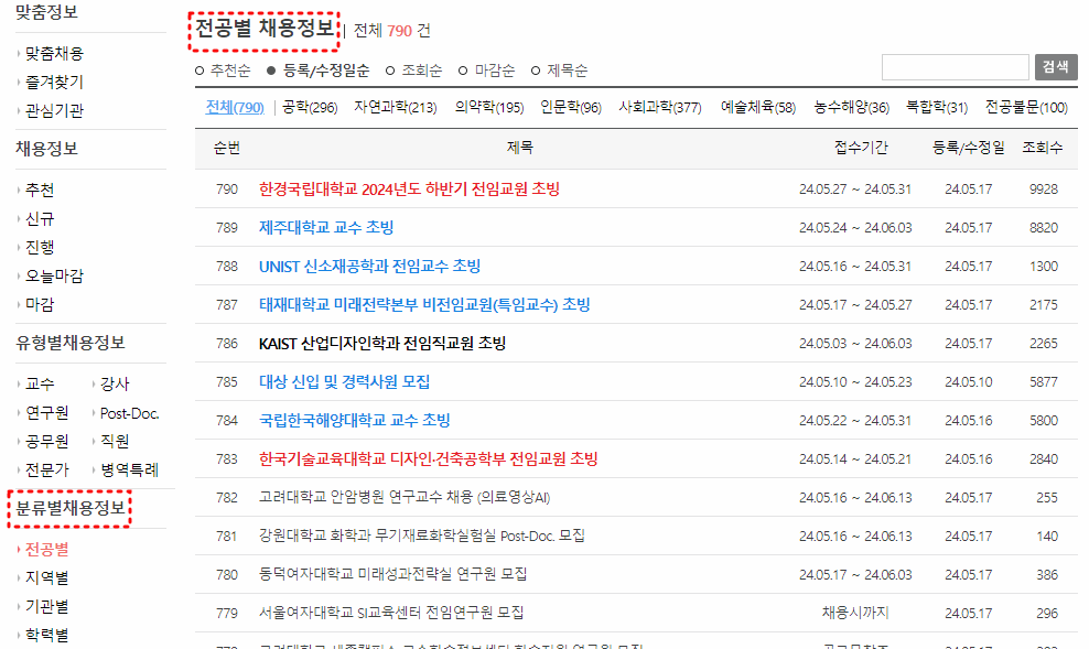 회원가입을 통해서 본인의 학위 등을 기준으로 맞춤채용이 가능하며, 새로 올라온 정보나 마감일을 기준으로도 채용정보를 검색할 수 있습니다.