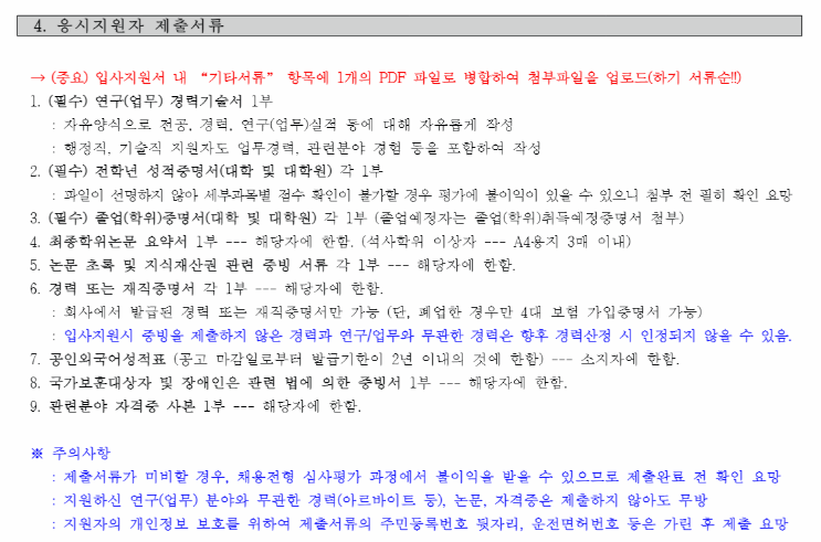 모든 서류는 "기타서류" 항목에 PDF 파일로 병합하여 업로드해야 해요. 서류가 미비할 경우 채용 전형에서 불이익을 받을 수 있으니 꼼꼼히 준비하는 것이 좋겠죠.