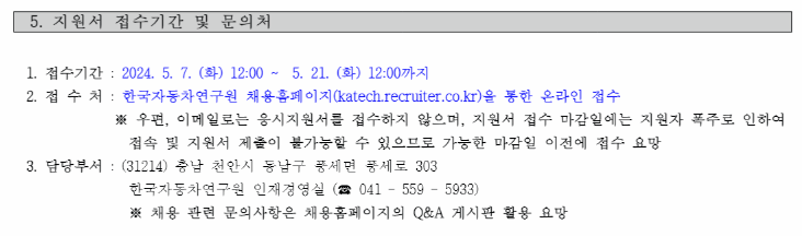 접수는 오직 한국자동차연구원 채용 홈페이지를 통해서만 가능하며, 우편이나 이메일로는 접수가 불가능하다는 점을 유의해주세요.