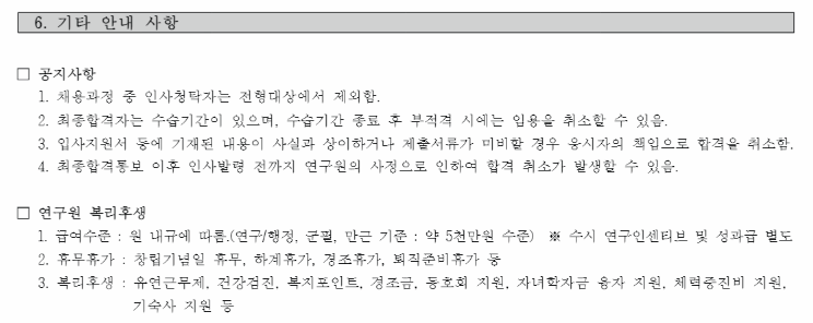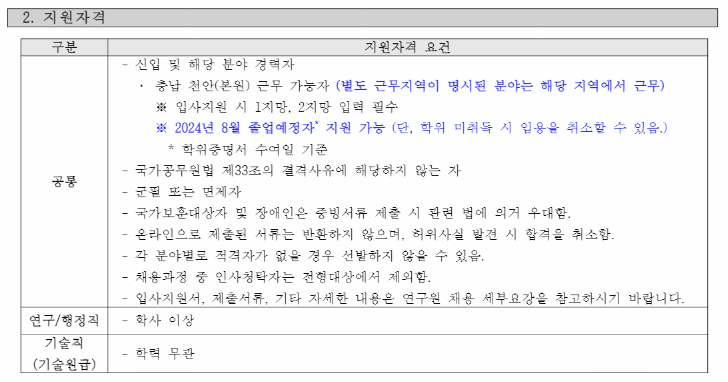 학력 조건은 연구/행정직은 학사 이상, 기술직은 학력 무관하게 지원이 가능하며 기술직은 기술원급으로 채용된답니다.