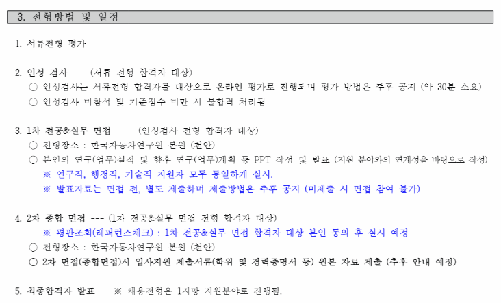 한국자동차연구원의 채용 전형은 크게 서류전형, 인성검사, 1차 면접, 2차 면접 순으로 진행된답니다. 먼저 서류전형에서 기본적인 자격 및 경력 사항을 평가해요.
