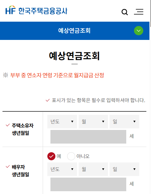연령과 주택 가격만 입력하면 기본적인 월 지급액을 바로 조회할 수 있습니다.
