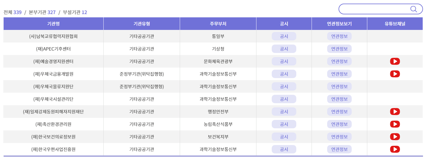 2024년 기준 기획재정부장관이 지정한 공공기관은 327개이며, 해당 기관의 주무부처, 공시상황, 각종 연관정보와 함께 유튜브 채널까지 확인할 수 있습니다.
