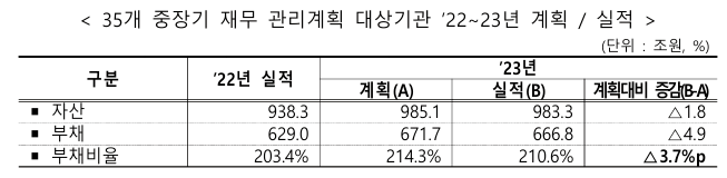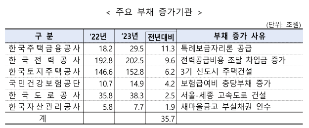 부채 증가의 주요 원인은 주거안정 실현을 위한 주택금융공사의 특례보금자리론 공급, 토지주택공사의 신도시 주택건설, 한국전력공사의 전력공급비용 조달을 위한 차입금 증가 등이 있었답니다.