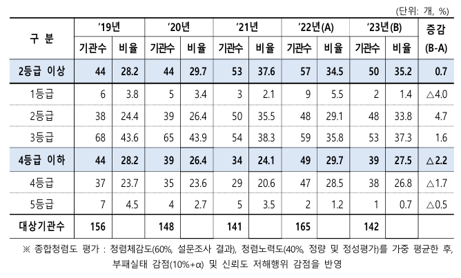 반면, 4등급 이하 비율은 2.2%p 감소하여 27.5%로 나타났답니다. 이는 공공기관의 청렴도 향상을 위한 노력의 결과라고 볼 수 있겠죠?