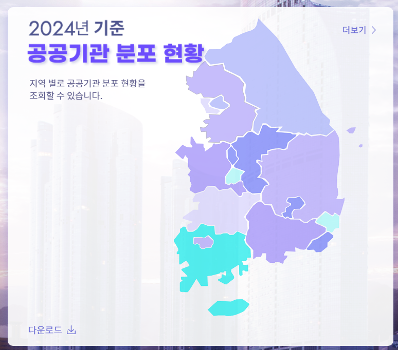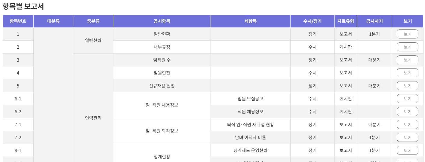 알기 원하는 공공기관을 선택하면 홈페이지, 조직도, 시설정보, 각종 분기별 및 항목별 보고서를 확인할 수 있으니, 직접 사이트를 방문하여 확인해보면 좋을 것 같습니다.