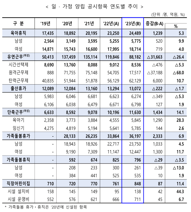 공공기관의 일·가정 양립 지표도 눈에 띄게 개선되었어요. 2023년말 기준 육아휴직 사용자 수는 전년대비 5.3% 증가했답니다.