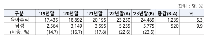 특히 남성의 육아휴직 사용자는 전년대비 9.9% 증가했어요. 이는 자녀출산과 양육을 장려하고 지원하는 정책의 확대 덕분이지요.