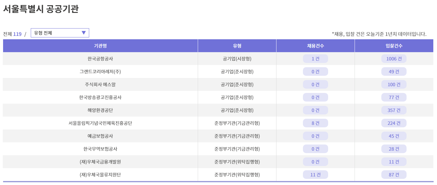 서울특별시를 선택하면 총 119개의 공공기관이 있는 것을 알 수 있고, 기관명, 유형, 채용 및 입찰 건수 등을 쉽게 확인할 수 있습니다.
