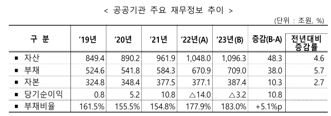2023년 공공기관의 자산은 1,096.3조원, 부채는 709.0조원으로 부채비율은 183.0%였어요. 당기순손실은 3.2조원으로 나타났답니다.