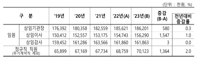 공공기관 직원들의 평균 보수는 2023년에 전년대비 2.0% 증가하여 70백만원이 되었어요. 기관장의 평균 보수는 186백만원으로 전년과 거의 비슷한 수준이었답니다.
