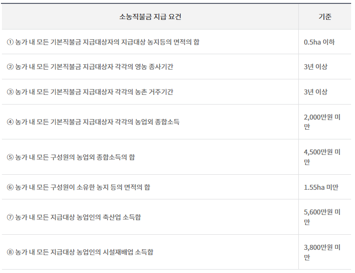 특히 소농직불금은 가구 단위 소득 기준을 충족해야 신청이 가능합니다.