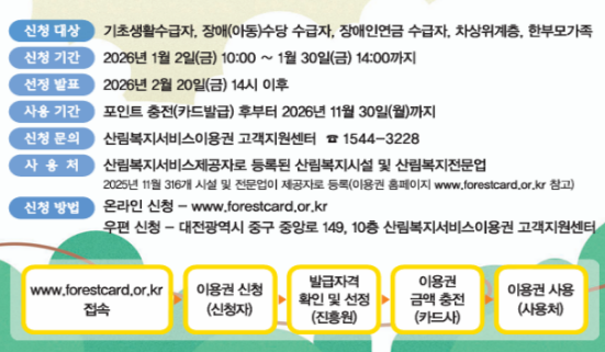 산림복지 바우처는 기초생활수급자와 차상위계층을 중심으로 지원됩니다.