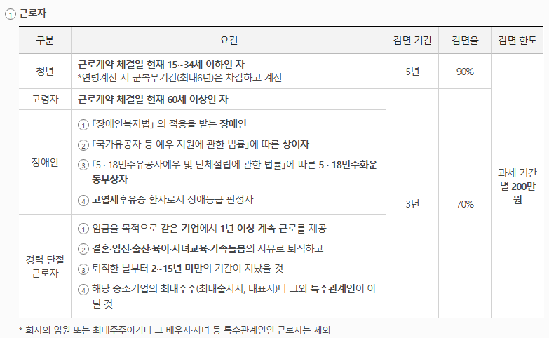 청년과 고령자, 장애인, 경력단절여성 등 대상별로 감면 비율과 기간이 다르게 적용됩니다.