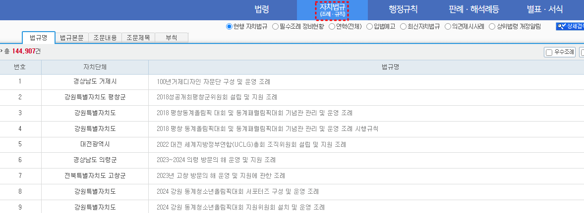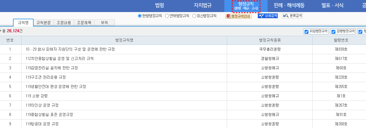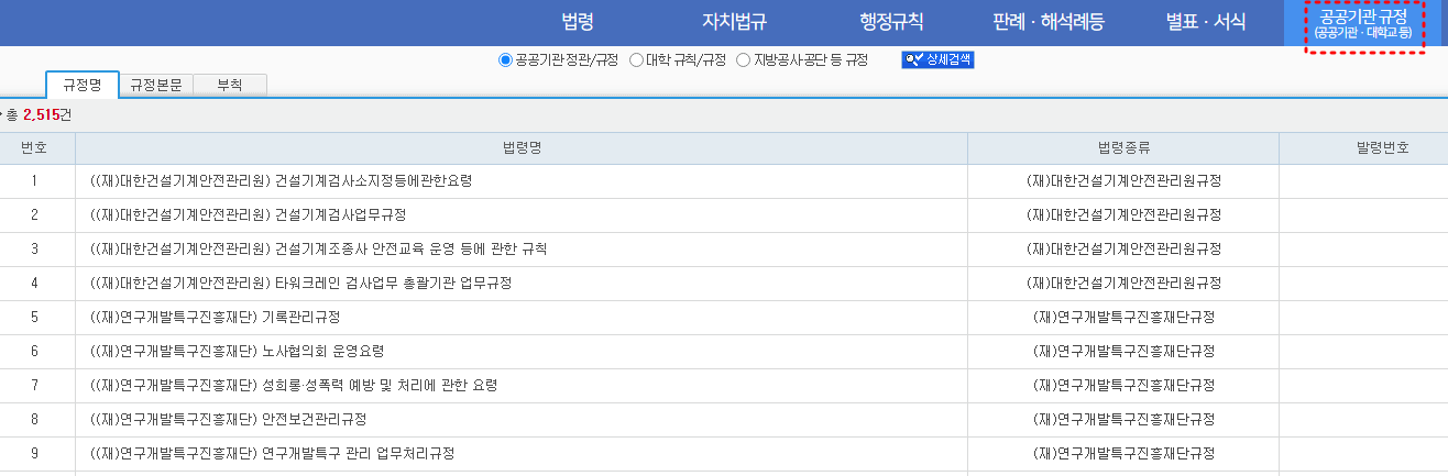 법령, 행정규칙, 자치법규의 별표 및 서식과 함께 공공기관, 대학, 지방공사, 공단 등의 규정 등도 상세검색을 통해서 찾아볼 수 있습니다.
