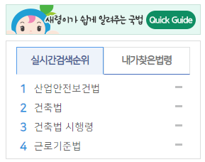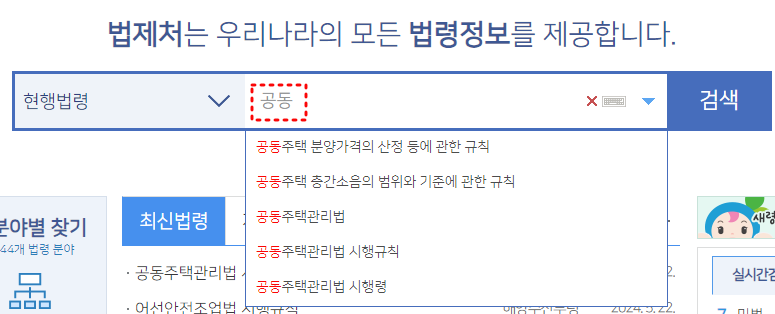 국가법령정보센터 홈페이지 에 접속하면 메인 화면에서 바로 궁금한 사항을 입력하여 조회할 수 있는데, 키워드를 입력하면 자동완성으로 검색할 수 있습니다.