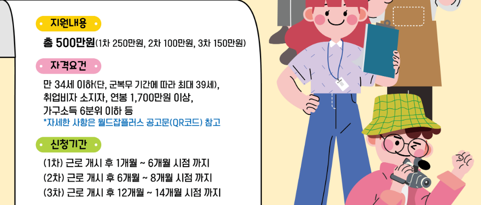 해외취업에 성공한 청년들을 지원하기 위한 정착지원금을 최대 500만원까지 지급받을 수 있으며, 월드잡 플러스 사이트에서 온라인 신청을 해야 합니다.